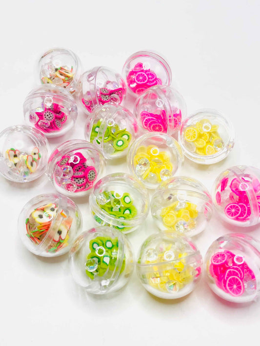 Shaker Transparent round ball with fruit slices and diamond beads.