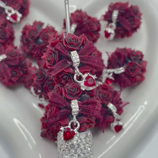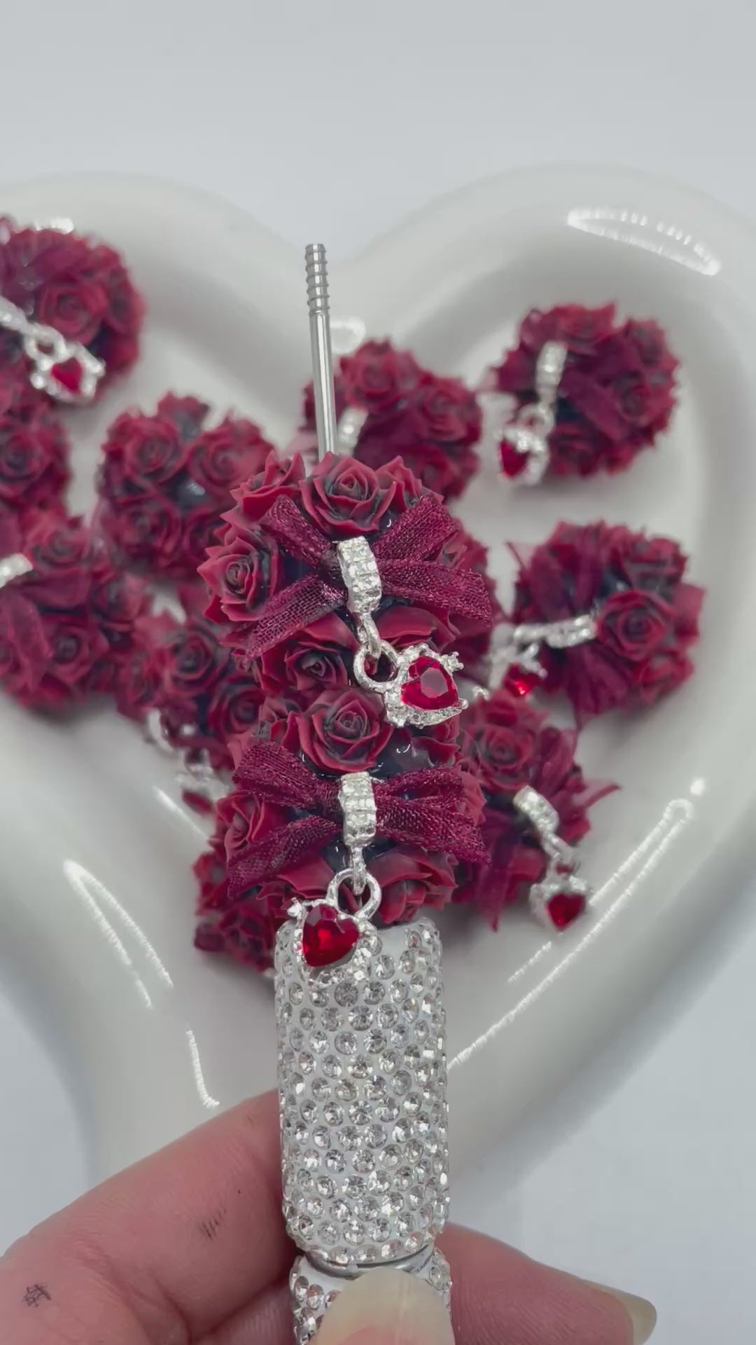 Beaded beadable fancy rose flower beads ornaments with lacy textile bow and crystal heart dangle