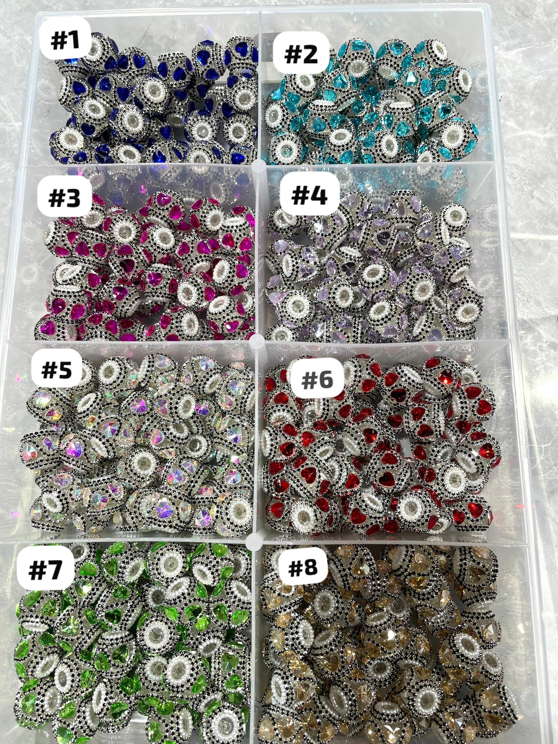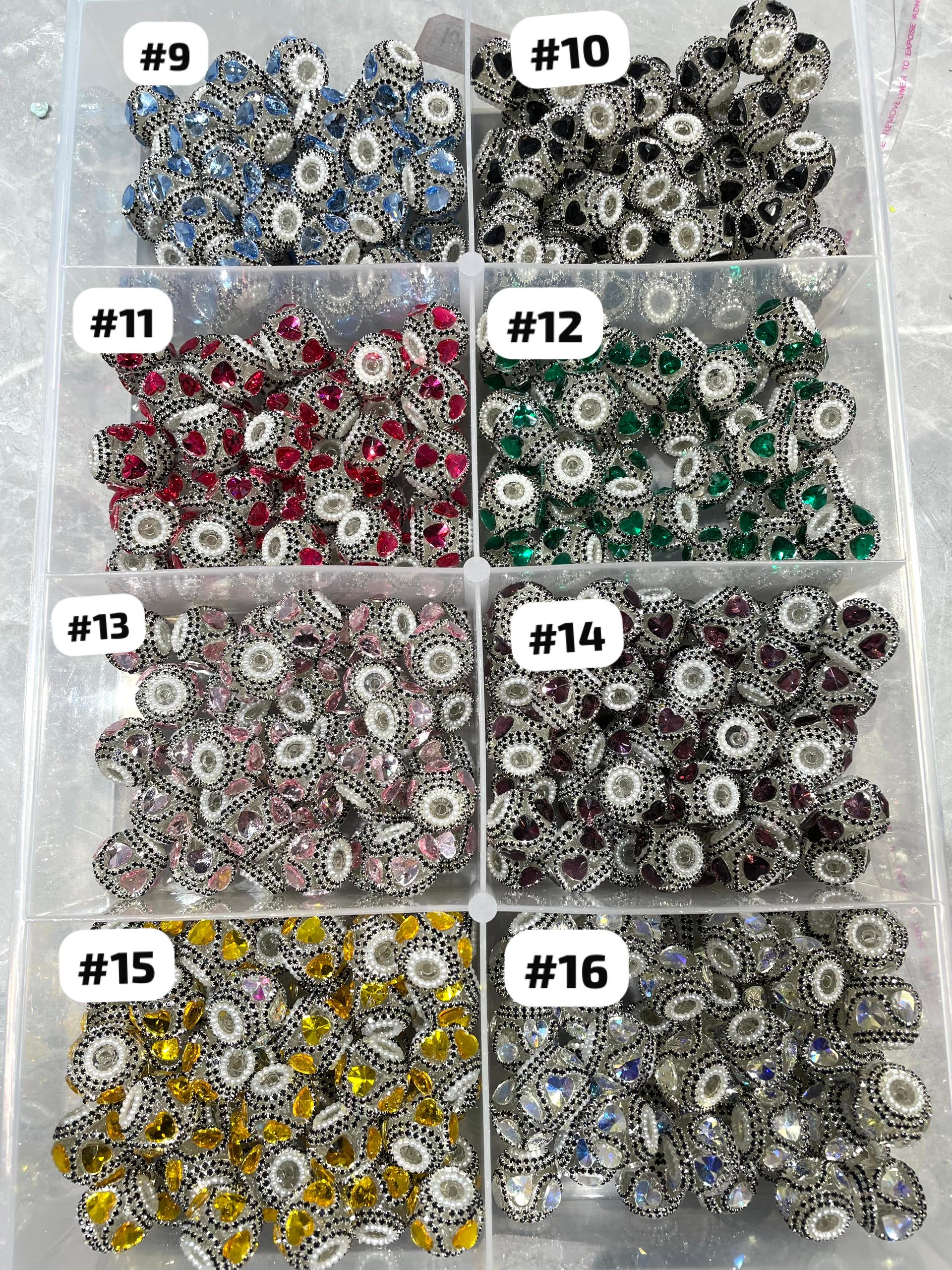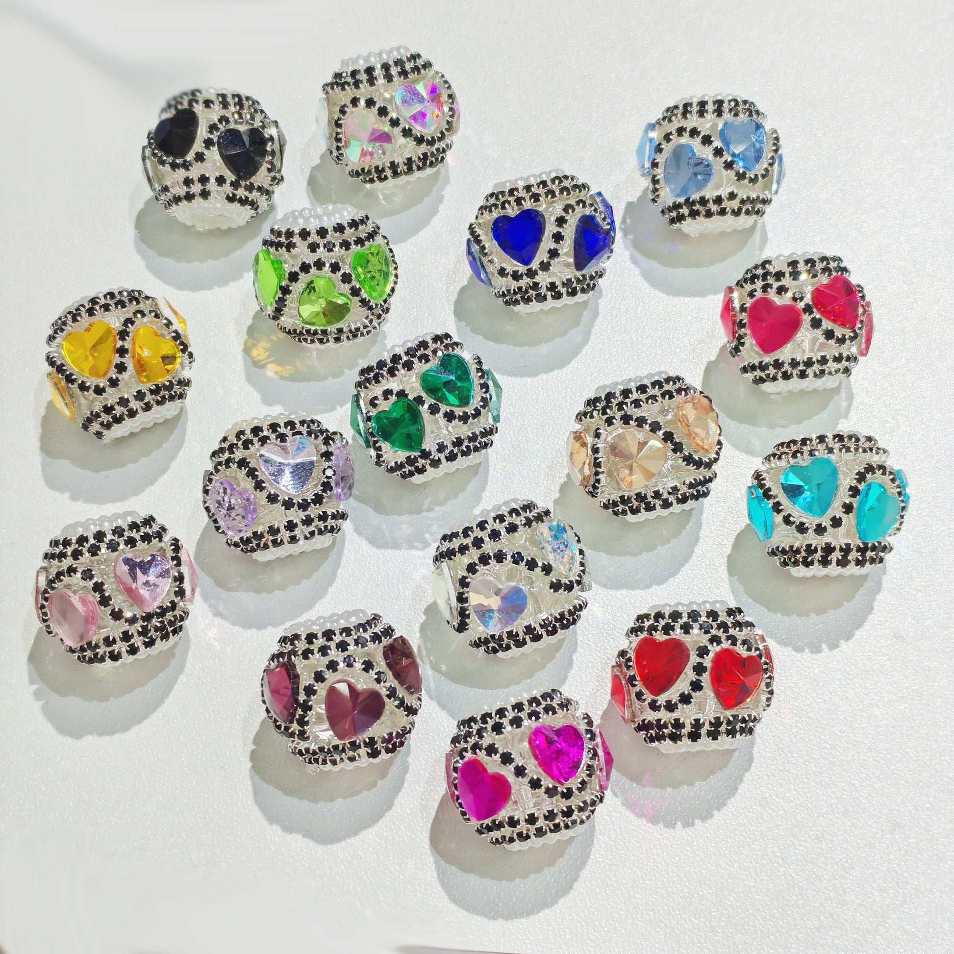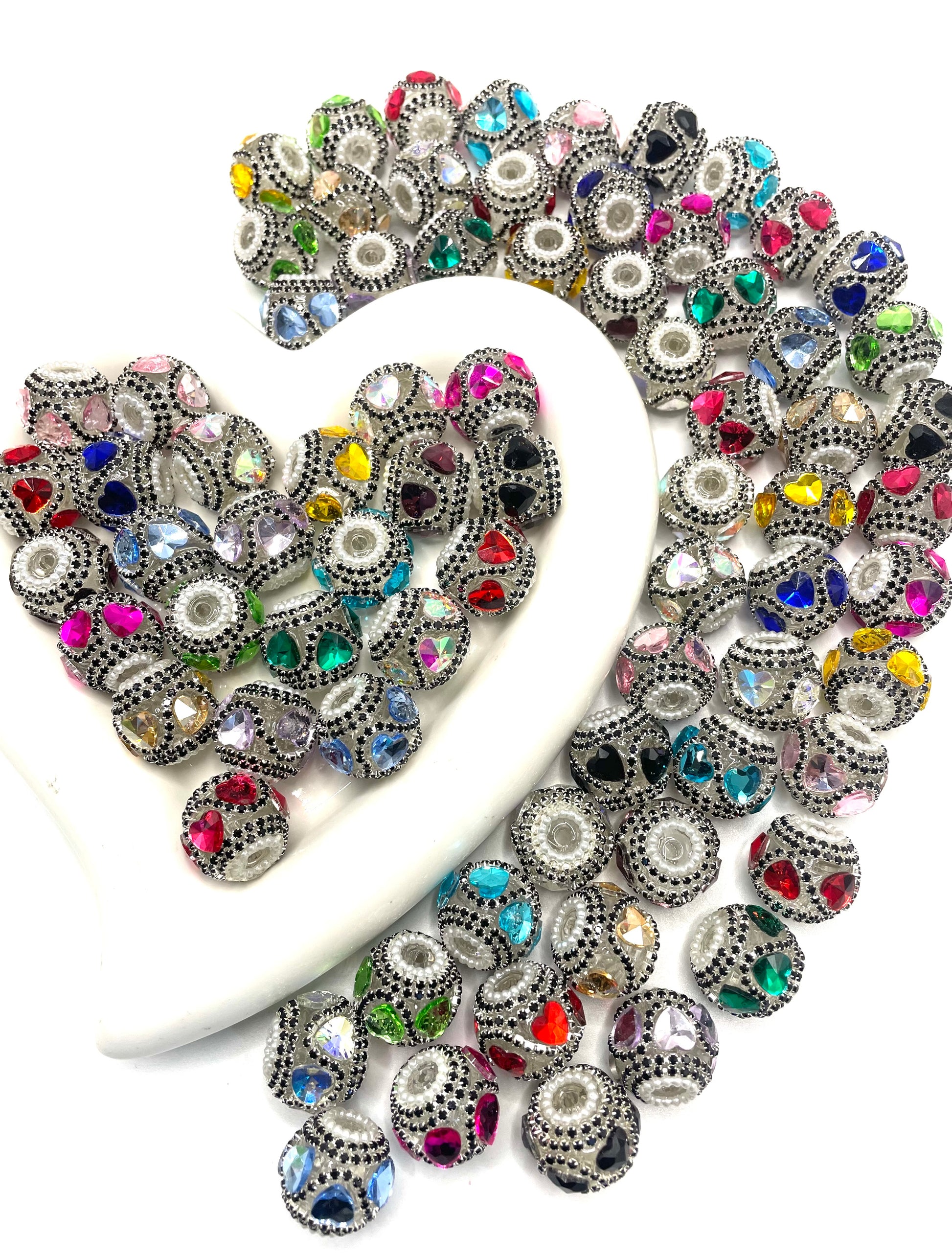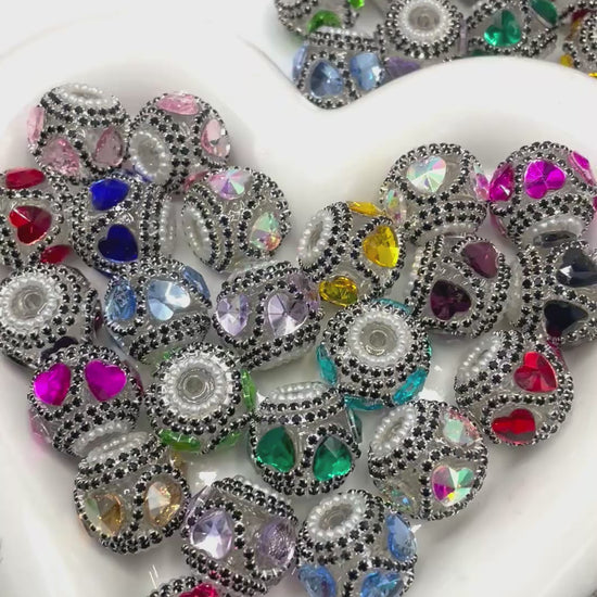 Beaded beadable clear transparent base acrylic fancy bead with crystal heart and black rhinestone chain and white color pearl ring