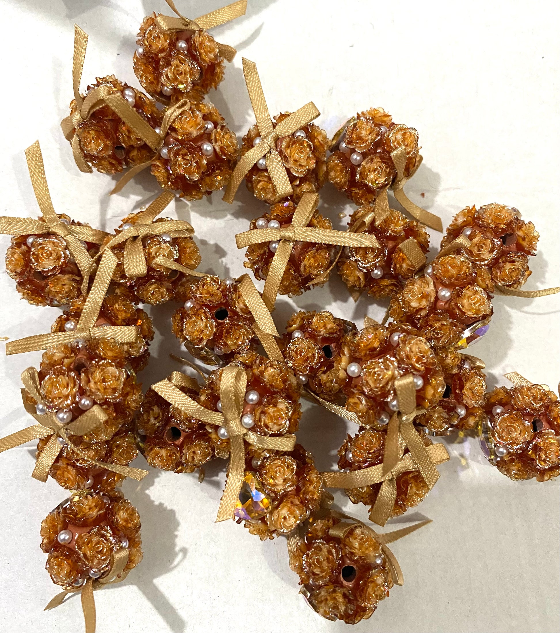 Soft flower beads with fabric bow and rhinestone heart