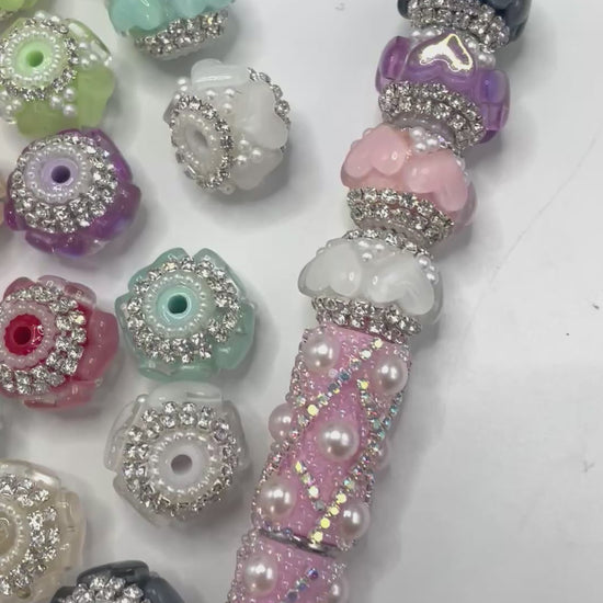 DIY acrylic fancy bead ornaments with glitter heart and rhinestone chain and pearl random mix